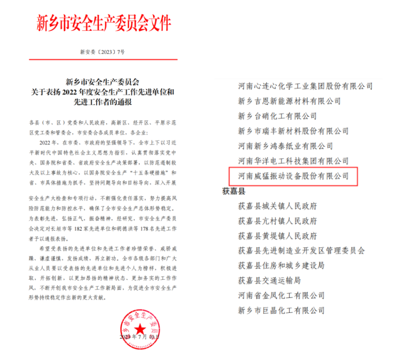 2023年7月,河南威猛振動設備股份有限公司被新鄉市生產委員會授予“2022年度生產工作先進單位”榮譽稱號。此項殊榮,是新鄉市安產委員會對公司工作的高度肯定。公司自成立以來,始終牢...