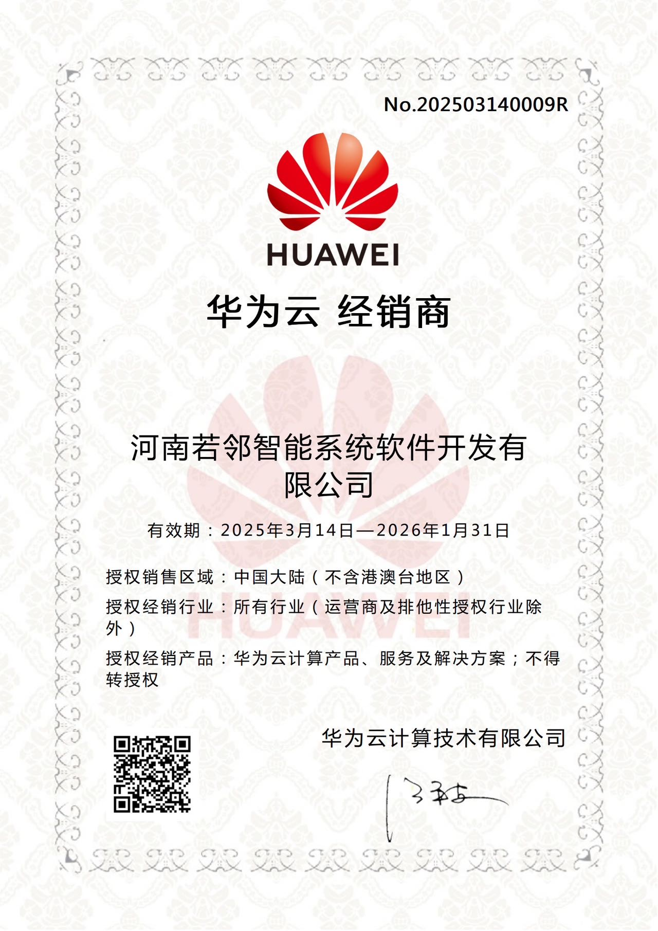 熱烈祝賀河南若鄰智能系統軟件開發有限公司正式成為華為云經銷商若鄰智能,讓未來觸手可及!在數字化轉型的浪潮中,云計算已成為企業實現業務創新、效率提升和成本優化的核心驅動力。作為一家致...